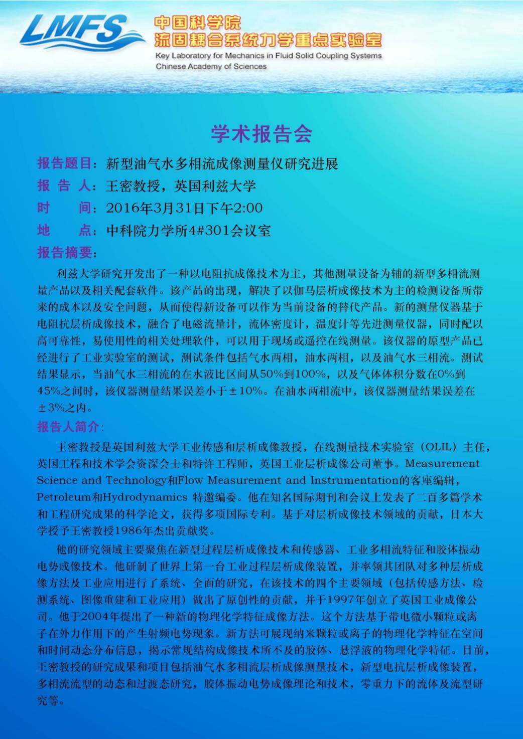LMFS学术会议(3月31日14:00)新型油气水多相流成像测量仪研究进展